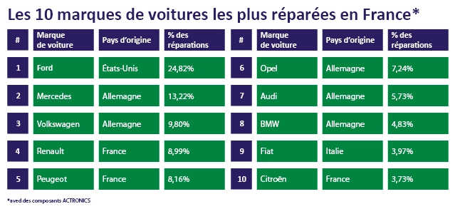 Les marques automobiles les plus souvent réparées avec des pièces ACTRONICS, en France