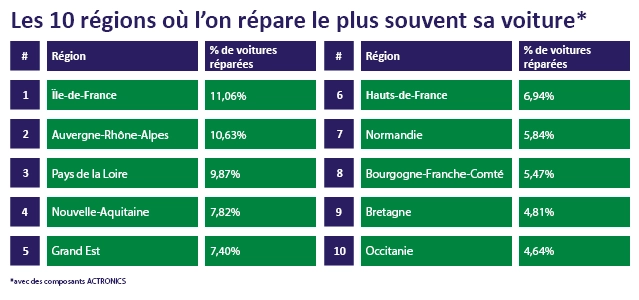 En tête du classement, l’Île-de-France : elle concentre 11,06 % des réparations réalisées via des pièces ACTRONICS en France. Rien d’étonnant sans doute : la région la plus peuplée concentre logiquement un volume plus important d’interventions. De plus, avec ses embouteillages et sa densité de circulation hors norme, la région parisienne met les véhicules à rude épreuve.