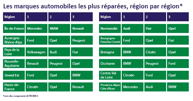 Les marques automobiles les plus souvent réparées avec des pièces ACTRONICS, région par région